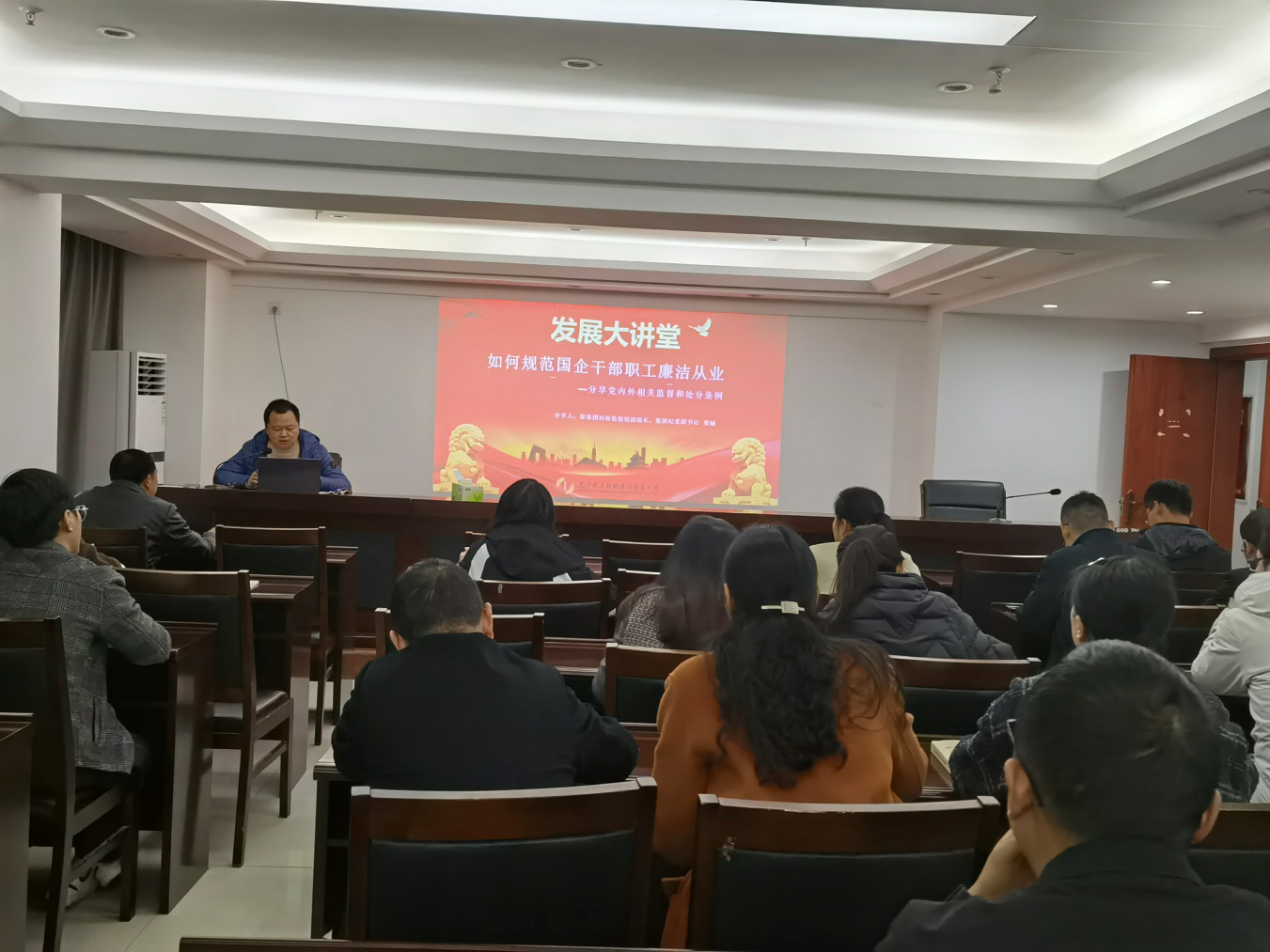 為充分營造集團公司風清氣正的干事創(chuàng)業(yè)環(huán)境,筑牢干部職工思想防線,守住從業(yè)廉潔底線,2023年12月1日,市紀委監(jiān)委駐巴中發(fā)展控股集團紀檢監(jiān)察組利用“發(fā)展大講堂”,為集團干部職工上了一堂以“如何規(guī)范國企干部廉潔從業(yè)”為主題的廉潔教育課,并觀看了警示教育片“失控的權(quán)力”。