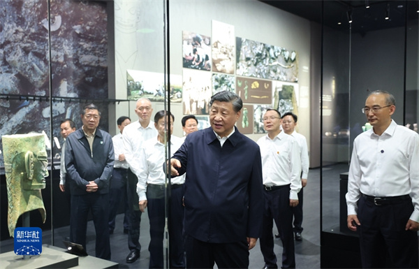 位于德陽市廣漢市西北鴨子河南岸的三星堆遺址,代表了數(shù)千年前的古蜀文明面貌和發(fā)展水平,是同時(shí)期長江流域文化內(nèi)涵最豐富、面積最大的都城遺址。26日下午,習(xí)近平來到三星堆博物館新館,參觀“世紀(jì)逐夢(mèng)”、“巍然王都”、“天地人神”等展陳,了解三星堆遺址發(fā)掘歷程和古蜀文明成果。在三星堆博物館文物保護(hù)與修復(fù)館,習(xí)近平走進(jìn)文保修復(fù)工作區(qū),仔細(xì)察看文物保護(hù)修復(fù)工作流程細(xì)節(jié)和最新技術(shù),同現(xiàn)場(chǎng)工作人員親切交流。習(xí)近平指出,三星堆遺址考古成果在世界上是叫得響的,展現(xiàn)了四千多年前的文明成果,為中華文明多元一體、古蜀文明與中原文明相互影響等提供了更為有力的考古實(shí)證。文物保護(hù)修復(fù)是一項(xiàng)長期任務(wù),要加大國家支持力度,加強(qiáng)人才隊(duì)伍建設(shè),發(fā)揚(yáng)嚴(yán)謹(jǐn)細(xì)致的工匠精神,一件一件來,久久為功,做出更大成績(jī)。習(xí)近平代表黨中央,對(duì)三星堆博物館新館的落成使用表示熱烈祝賀,向廣大考古工作者表示衷心感謝和崇高敬意!